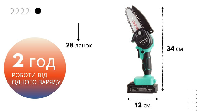 - Комплектація: Акумулятор, зарядний пристрій, шина – 1 шт., ланцюг – 1 шт., викрутка – 1 шт., ключ для затиску ланцюга – 1 шт.